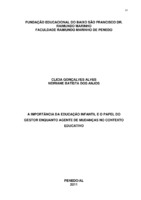 LÚDICO: METODOLOGIA DE ENSINO PARA OS ANOS INICIAIS DO ENSINO FUNDAMENTAL (1º, 2º E 3º ANOS) Este trabalho monográfico aborda a temática “Lúdico: metodologia de ensino para os anos iniciais do Ensino Fundamental (1º, 2º e 3º anos)”. O objetivo principal é compreender a importância dos jogos e brincadeiras para o ensino-aprendizagem nas referidas séries e apresentar sugestões de atividades lúdicas para dinamizar o ensino de forma que todos os alunos tenham oportunidades de aprender significativamente. O estudo está dividido em três capítulos que tratam da importância do brincar para o desenvolvimento das habilidades das crianças e do seu processo de socialização, conceitua o lúdico, jogos e brincadeiras enfatizando que esses aspectos fazem parte do desenvolvimento da criança; do apontamento de características relacionadas ao lúdico na legislação educacional; faz uma abordagem sucinta sobre os jogos e brincadeiras no desenvolvimento infantil delimitando as fases do desenvolvimento; enfatiza ainda a formação do professor como um desafio para vencer as dificuldades dos educandos e condição prioritária para trabalhar num contexto de ludicidade; aponta uma série de atividades lúdicas para os primeiros anos do Ensino Fundamental almejando dinamizar o processo ensino-aprendizagem para que a educação escolar tenha um significado importante na vida pessoal e social de cada aluno. -
